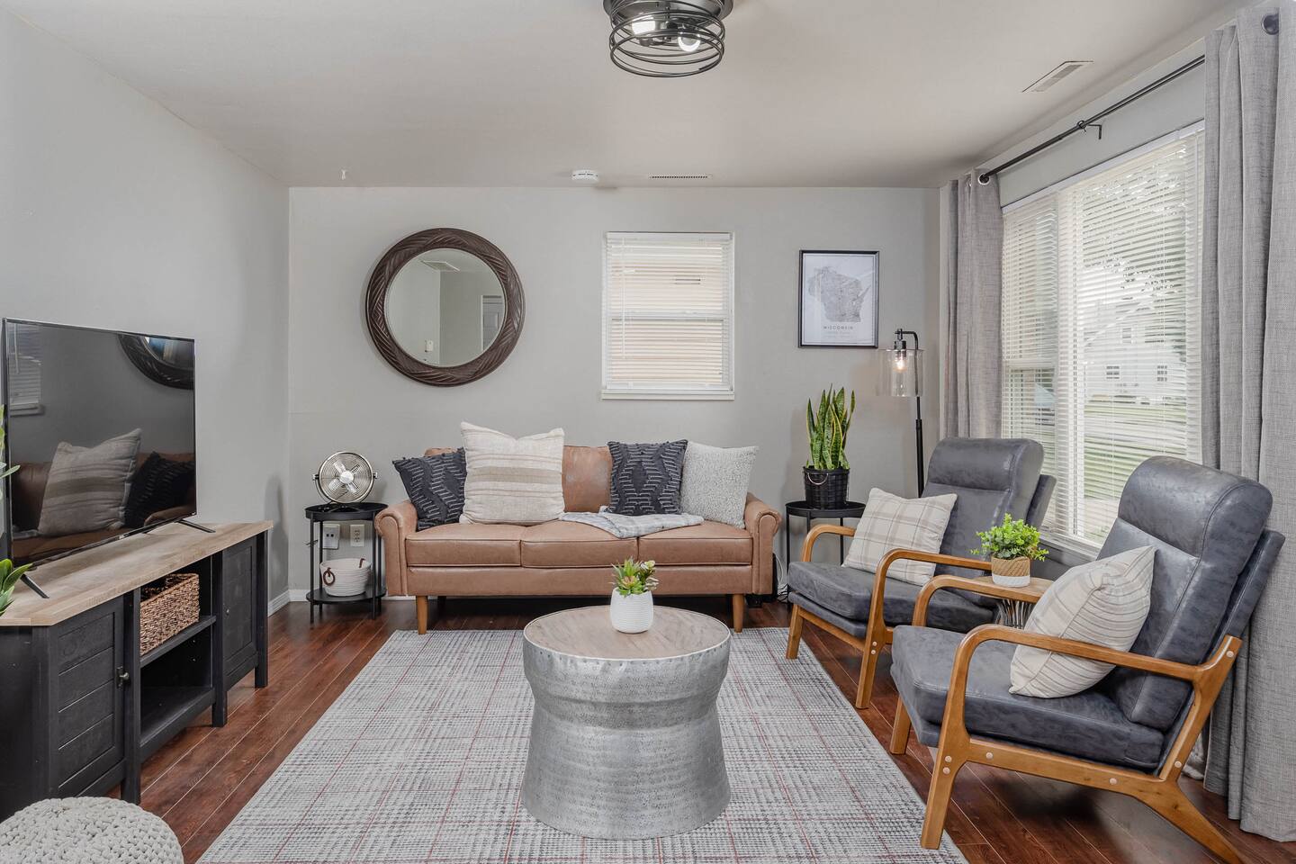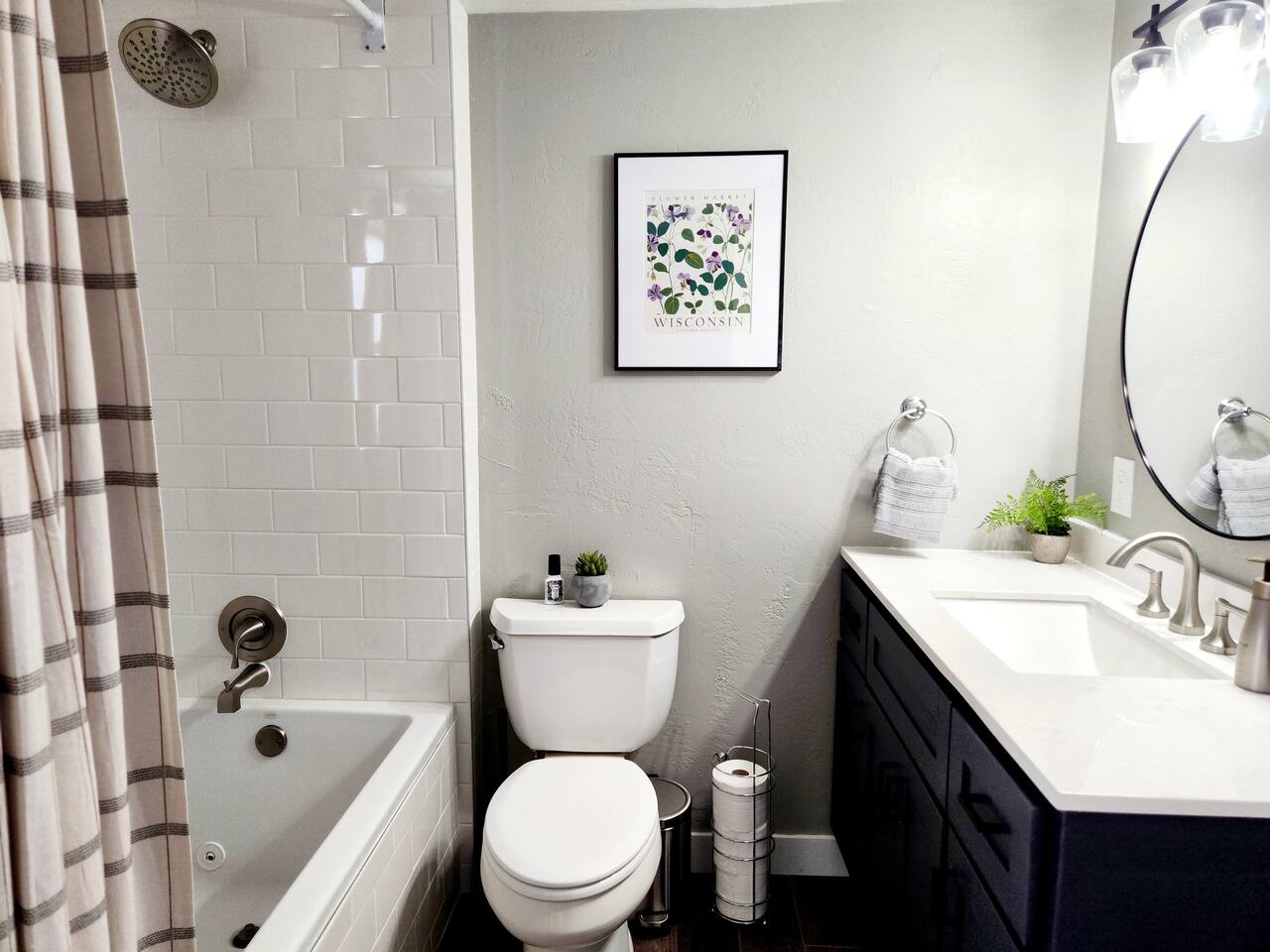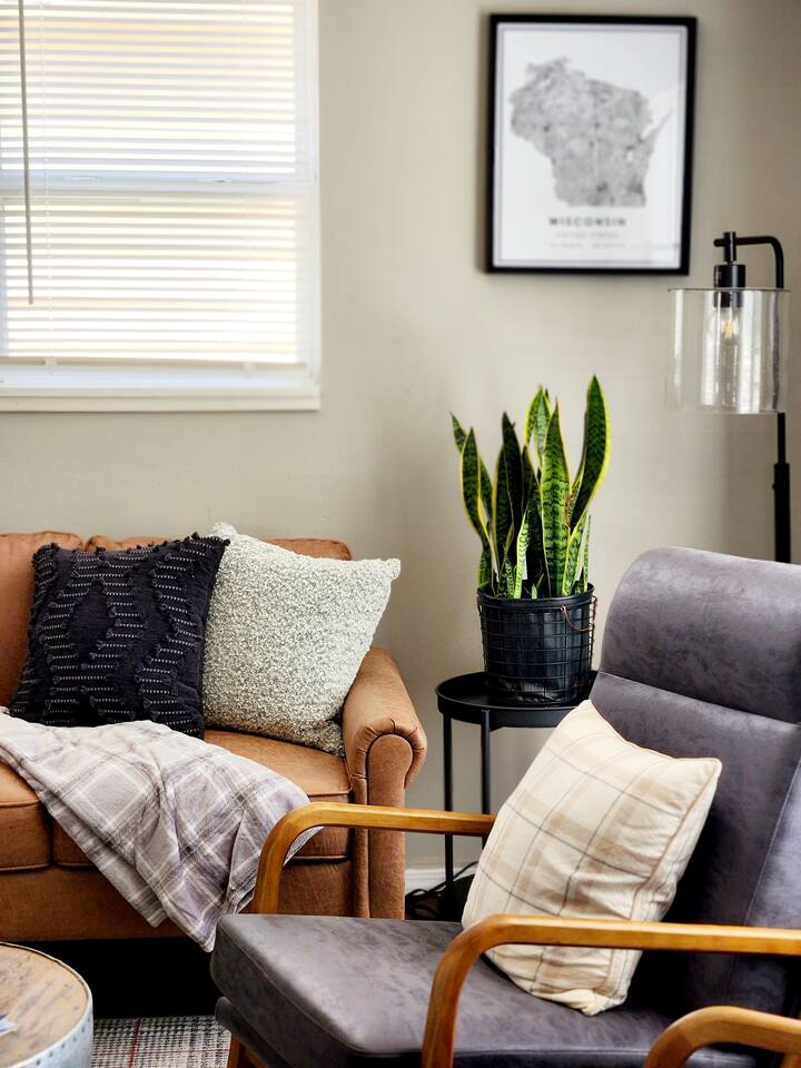 -Located in a quiet neighborhood with a spacious backyard in the heart of Little Chute, WI. -New, modern furnishings -High quality towels and linens -Fully equipped kitchen -Complimentary coffee, snacks & beverages -High speed Wi-Fi -Washer and dryer for guest use -Several restaurants, coffee shops, and shops within walking distance! The first bedroom features a queen size bed with comfortable hybrid memory foam mattress. The second bedroom features a full size bed with hybrid memory foam mattress and cozy seating area. The living room has a large smart TV and high speed wi-fi. Our fully stocked kitchen comes with everything you should need during your stay, including a Keurig coffee machine and k-cups provided. The bathroom has a brand new beautiful quartz vanity, a fully tiled shower/tub combo and a front loading washer + dryer with laundry pods & dryer sheets provided. The backyard is a spacious lawn & brick patio area, complete with a small dining table & chairs. We take great care in designing our properties, always keeping our guest's experience top of mind. We love adding all sorts of extra touches to the space to help you relax enjoy your stay!